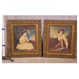 Framed print "Two Girls and the Cat" by Louis Icart; 274-303 - ornate gold frame - 33.5x27.5