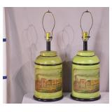 Pair of green metal train decorated lamps; 253-181 - (dirty finish) - 9.5x9.5x28