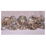 Large group of misc silver plate items; 274-381,382 - trays, ice bucket, covered dishes, oil & vinegar set, coffee set, etc. - (1 handle broken on sugar)