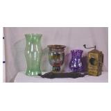 Group of 5 misc items - large green hurricane globe; purple vase, carved wooded sculpture, grinder; 908-198 - (1 vase is cracked)