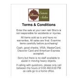 All items sold as is. All sales are final. Cash, good checks, VISA, MasterCard, Discover Card and American Express accepted. Sorry but there is no staff available to assist in moving heavy objects. Not responsible for accidents or injuries. Numbers at 9:30 AM Thursday. We will honor a handwritten list of names compiled prior to 9:30 AM Thursday morning, however we are not responsible for monitoring the list. We will call off the names and pass out the first round of numbers from a single list which will be affixed to the front door of the home. If calling with questions, please only call between the hours of 9:00 AM-9:00 PM as calls go to a home office.