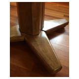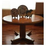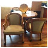 Dining table with pedestal base and 6 rolling club-style chairs in beige fabric. Table is 45” in diameter without leaf. 24” leaf. Comes with sturdy pads for the basic table and extension.