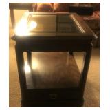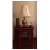 · Various coffee and end tables including Ethan Allen occasional table with shelf, CTH Sherrill lamp table with drawer, nesting table set, mission style end table with drawer and book shelf; square mission style with glass top