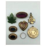 Jewelry including 10k cameo, Ruby and diamond rain, Russian a nano silver spoon, Elgin pocket watch and others, diamond pendant, 14 karat diamond tennis bracelet, coin silver alginate pocket watch, black pearls, turquoise, topaz ring, wrist watches, Swarovski bracelets, carved jade pendant, etc.