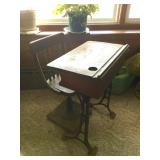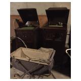 FURNITURE: Vintage Hoosier, Victrolas, Antique Jelly Cabinet, Set of 6 John Vogler Group Chairs, Two Tier Pie Crust Table, Pair of Mahogany End Tables, Hale Company Vermont Corner Cabinet, Book Shelves- Small & Large, Cherry Vanity & Stool, Coffee Table, Twin Beds, Plant Stand, Antique Side Tables, Vintage Typewriter Table, Record Holders, Vintage School Desks, Full Size Mahogany Pineapple Bed, Blanket Chest, Desks, Bureaus, Trunks, Checker and Cribbage Coffee Table, Mahogany Hutch, and more!