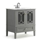 Simpli Home Paige 30 in. W x 21.5 in. D Bath Vanity in Warm Grey with Marble Extra Thick Vanity Top in White with White Basin. You are seeking that perfect bath vanity to fit into your urban or contemporary bathroom room. You want something is stylish, functional. The 30 in. Paige Bath Vanity has it all. This vanity has plenty of storage with two tempered frosted glass doors opening to large interior space and one bottom drawer for extra storage. It is constructed with solid, hardwood frame and legs. Its contemporary look is on trend and adds a luxurious spa feeling to your bathroom. NEW in Retail Packaging. Please Preview. Retail $899.00