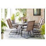 Hampton Bay Crestridge 7-Piece Padded Sling Outdoor Dining Set in Putty (2 Boxes). Add a beautiful complement to your outdoor space with this 7-piece outdoor dining set. A wood-pattern ceramic tile tabletop and rich chocolate brown finish create the perfect classic look. The powder coated steel frame adds rust resistance and long-lasting style, while the sling fabric combines comfort and durability. Ideal for large gatherings. NEW in Retail Packaging. Please Preview. Retail $697.00<120> |