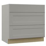 Hampton Bay Shaker Assembled 36x34.5x24 in. Pots and Pans Drawer Base Kitchen Cabinet in Dove Gray. The furniture-quality finish on the Hampton Bay Drawer Base Cabinet adds warmth and beauty to your kitchen design. The cabinet has three 4-sided hardwood drawer boxes that open easily on smooth ball-bearing glides, giving you easy access to a convenient storage space. The cabinet is preassembled for hassle-free installation. In Opened Retail Packaging. Please Preview. Retail $447.00<140> |