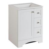 Glacier Bay Lancaster 24 in. W Vanity in White with Alpine Vanity Top in White. The Glacier Bay Lancaster 24 in. W Vanity in White with Alpine Vanity Top in White has classic styling that will complement a wide variety of bath or powder room decor. Featuring a brilliant white finish for a clean and fresh look, this vanity offers ample storage space with a large interior cabinet and 3-drawers. The white vanity top is resistant to bacteria, mold and mildew for lasting beauty and durability, has an integrated bowl and is pre-drilled for a 4 in. center set faucet. With decorative touches including nickel hardware and a toe kick, this vanity is a simple solution to elevating your decor. NEW in Retail Packaging. Please Preview. Retail $229.00