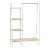 IRIS White and Light Brown Metal Garment Rack with Wood Shelves. Clothing storage made easy. This metal garment rack with wood shelf provides a convenient closet solution for small spaces. The built-in wood shelves at the bottom and on the side great for storing shoes or folded clothes, while the two foot wide closet rack gives you plenty of space to hang your clothes. Side shelves are also great for home decor or storage when shelf is out in the open. In Opened Retail Packaging. Please Preview. Retail $75.83 |