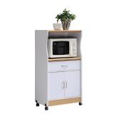 HODEDAH 1-Drawer White Microwave Cart . Contemporary and functional, this HODEDAH Microwave Cart is the perfect solution for your kitchen storage needs. The large open storage space at the center houses your microwave. The top shelf can be used to store your toaster oven. It has an enclosed cabinet space which provides compact kitchen storage for small kitchen appliances, pots and pans. It features a drawer for utensil storage. This microwave cart features wheels, which allows for easy mobility if necessary. It is made of wood, which ensures strength and durability. In Opened Retail Packaging. Please Preview. Retail $79.87 |