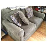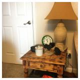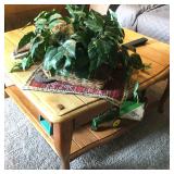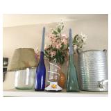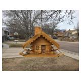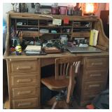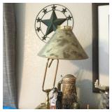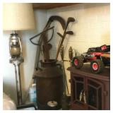 RED CLAY BIRD BATH Old fashion phone Roll top desk Artwork Old file cabinet Lamps and shades Antique saw Antlers/ skulls Oil painting Milk can End table Lantern floor lamp Accent table DVDs Cabinet with cupboards Coffee table Love seat Couch Wooden antique hand tools and golf clubs