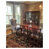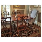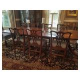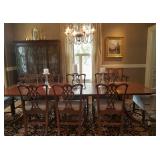 Quality Mahogany Double Pedestal Dining Table with leaves as well as **Set of 10 Chippendale dining chairs (two arm). ** 2 Extra Upholstered Chairs in Matching Fabric.