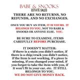 WE CANNOT HELP WITH MOVING /CARRYING PURCHASED ITEMS. NO EXCEPTIONS. PLEASE BRING HELP TO MOVE ITEMS OR SCHEDULE A MOVER. IF YOU NEED A MOVER, WE CAN GIVE YOU RECOMMENDATIONS. BABE AND SNOOKS DOES NOT GUARANTEE THE AUTHENTICITY OR WORKING ORDER OF ANY ITEM. EVER. AGAIN, PLEASE INSPECT YOUR PURCHASES THOROUGHLY BEFORE YOU PURCHASE THEM. THERE WILL BE NO REFUNDS. NO EXCEPTIONS. WE HAVE A LIMITED AMOUNT OF BAGS AND BOXES, SO PLEASE BRING YOUR OWN. KINDLY HELP THE ENVIRONMENT AND FUTURE GENERATIONS BY RECYCLING AS OFTEN AS YOU CAN. SET A GOOD EXAMPLE AND ONLY TAKE WHAT YOU NEED. ADDITIONALLY, YOU ARE RESPONSIBLE FOR YOUR OWN PACKING AND CARRYING OUT, SO PLEASE BRING SOMEONE TO HELP FOR HEAVY PURCHASES. Babe & Snooks Estate Sales accepts CASH. CREDIT CARDS & DEBIT CARDS. Checks are NOT accepted. BABE & SNOOKS IS NOT RESPONSIBLE FOR ACCIDENTS OR INJURIES. ENTER AT YOUR OWN RISK. THERE IS NO SIGN IN SHEET, THERE ARE NO NUMBERS HANDED OUT. PLEASE FORM A LINE AT THE ENTRANCE. YOU WILL BE ADMITTED TO THE SALE ONE BY ONE ACCORDING TO YOUR PLACE IN LINE. IF YOU LEAVE THE LINE, YOU WILL NEED TO GO TO THE END OF THE LINE. IF THERE IS ANY ARGUMENT, FIGHTING, SHOVING OR CUTTING IN LINE, YOU WILL NOT BE ADMITTED TO THE SALE. POLICE WILL BE CALLED IF YOU CREATE A DISTURBANCE. DISCLAIMER: PLEASE NOTE THAT SOMETIMES ITEMS ARE REMOVED FROM A SALE BY FAMILY MEMBERS AFTER THEY HAVE BEEN PHOTOGRAPHED. PLEASE MAKE SURE TO CHECK BACK THE DAY BEFORE THE SALE FOR THE MOST UPDATED LIST. |