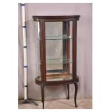 Small inlaid mahogany French style kidney shaped curio cabinet; 55-5325 - mirror back and bottom - glass shelves - curved glass on door and sides - (finish as-is; chip in molding) - 28x15x54