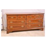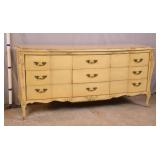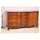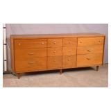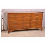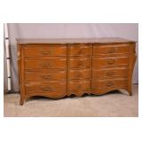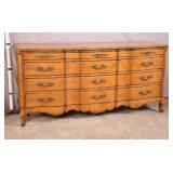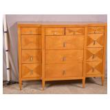 Baker 13 drawer triple dresser with tapered legs; 55-5303 - match grain curly maple veneer - (finish as-is) - 56x20.5x41.5