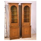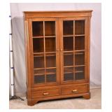 Ethan Allen maple 2 part china cabinet; 55-5240 - divided silver drawer - raised panel doors on base - adjustable shelves - (deep scratches on top of base) - 38x18.5x71