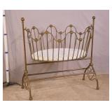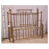 Brass queen size brass bed with metal bed frame; 55-5286 - (missing 5 porcelain balls and several brass caps on footboard) - 72x63.5 headboard size