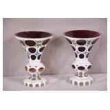 Pair of decorated white and cranberry glass vases; 253-206 - (small chip/flake on top) - 5.5x5.5x7
