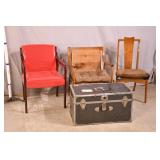 Group of mid-century side chair, trunk, red open arm chair and mid-century open arm chair; 74-5316,4442,5264, 5308 - (all as-is)