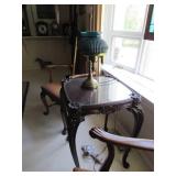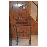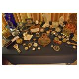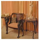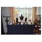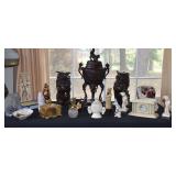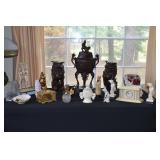 Cast Iron Buffalo Bank, Asian/Chinese Ornately Carved Urn/Covered Dish, Tea Pot with Twisted Stationary Handle Upper Half of Body with Dotted Design 1920 Japan, Black a Moon Male 14” Brass Base Iron Nude Torso with Gold Stripe Knee Length Trousers with Rope Trist Brass Belt CA 1900, Teakwood Carved 32” Pink Round Marble Top Shelf at bottom Six Sided Lets Curved Tapering to Paw Feet Ca 1900 Chinese, Walnut Table Curved Stretches Base Iron with Center Iron Dangle 1930, Pain Mahogany Lamp Tables 18” x 28” High Chippendale Style Hand Carved Shells at Edge 1930, Ebony Stool 16” x 13” with Six Pointed Petal Hand Carved Star Design Cameroon Africa 1940, Five Peace SP Tea Service by Oneida with Floral Design, Cast Vintage Dog Door Stops, Pottery Vase & Figures, Asian Wax Seal Set, Lenox Swan, Art Czech Gold Covered Dresser Box, Deco Dancing Lady Ashtray, Bike Bell, Kenyan Soapstone Carving of Lady, Frosted Glass Art Deco Nude, Wood Carved Antelopes, Brass Horse, Pottery Ram, Barometers, Brass Items, Pitcher & Bowl, James the Standing Butler with Tray, Brass Table Butler, Adams Clicker, Vintage Bike Bell, Marbles Compass, Stanley London Brass Compass with Level Natural Sine, Baldwin Brass Candle opera, Brass Barometers, Brass Ducks, Brass Eagle, Brass Shell Sconce, Symmons? Hot Water Kettle 1890’s, Reuven Art Glass,