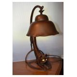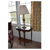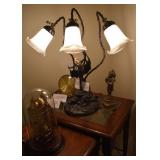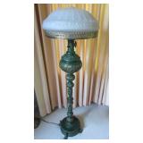 Victorian Organ/Piano Floor Lamp, Pond Lily Tiffany Style Lamps with Brass Base, Silver Tone Body over White Metal with Green Crystal Insert 12” x 9” Floral Petal Shaped with Gold Tone Body Woman with Arms Out Stretched Holding Green Fluted Dress, with Green Crystal Insert in Tiffany Style 1900, Table Lamps. Sarsaparilla Lamp with Frosted Shade, Sarsaparilla Train Dining Car Lamp Deco Style,