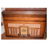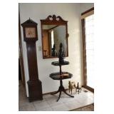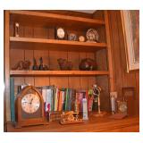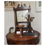 German Grandfather, Charles Jacque-Notre Dame Triple Trinity Westminster Chimes Quarterly Brass Dial and Pendulum with Brass Weights 1900s, Howard Miller 77” Grandfather Clock Moon Ship Dial with Scrolled Pediment, Brass Weights & Triple Chime, Beveled Glass Sides, Colonial Mfg. Mahogany Case from Zeeland, Mi. with Brass Dial Pillan & Scroll Pediment on Bonnet, Strikes Hour and Half Hour 1982, German 7’ H 1985 Mahogany Chippendale Style Claw Feet with Beveled Glass Sides & Brass Moon & St Michael Westminster Chimes Grandfather Clock, Clocks, Mantle Clocks, Carriage, Anniversary, Desks, Dresser, Shelf Clock, Mid-Century & Wall Clocks, Seth Thomas Mantle Clock,8 Day Banjo Clocks, New Haven Banjo Clock, GE Wall Glock Session Mantel Clock, Celluloid Small Clock, Heco, Sewca, Bulava, Kundo, Sessions, Goldbuhl, Looping Hudson 8 Day, Westclox Scotty on Stand, Hershey Metal Productions Thermometer With Spaniel on Lucite, 1920’s Phinney Walker Jewell Clock (Back is open & Should be), Brass and Glass Coenaho CCCP K Clock, Euramca Clock with Etched Glass & W Minister Chimes, Forestville Connecticut Clock Glass Day Clock w/key, AirGuide Barometers, Miniature 1880’s New Haven Clock,