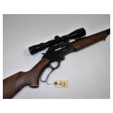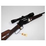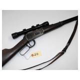 20 (CR) Winchester 94 30.30 Lever action with front and rear sights, Redfield 4X scope with side mounts, sling, 20" barrel, SN 2852379. Made in 1965. Condition: Lots of wear, mostly on frame, but overall a clean gun. Front sight blade missing. Good bore and action.
