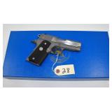 28 (R) Colt Lightweight Officers 45 Pistol MK IV Series 80 stainless steel semi-auto with hammer, 2-mags, 3 1/2" barrel, SN LF08787E. Condition: Like new with box & sleeve.