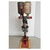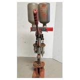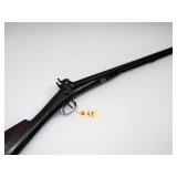 48 Unmarked 12 Ga Percussion Side-by-side muzzle loader with double hammers & triggers, brass patch box & trigger guard, 32" barrel. Condition: Lots of wear. Crack at fore end. Hammers function fine.