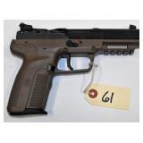 61 (R) FNH Five Seven 5.7X28 Pistol Semi-auto with adjustable sight, mag, 4 3/4" barrel, SN 386283448. Condition: Part of slide cover is broken. Also a crack at plastic grips. Appears to function fine. Otherwise good condition.