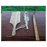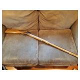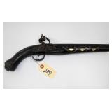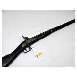 44 U S 1897 69 Cal Musket Flintlock muzzle loader, made around 1808, full ram rod, brass trigger guard, "IR" stamped on stock, 44" barrel. Condition: Lots of wear. Cracked stock. Spring loose at hammer.
