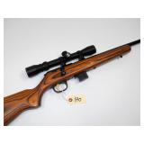 7 (CR) Mossberg 144 LS 22 LR Target Bolt action with front sight, mag, bracket for rear peep sight, Simmons 4X32 scope, sling, 26" bull barrel. Condition: Several light scratches. Overall great condition. Excellent bore and action.