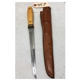 529 Queen Steel #77 Made in USA Fixed Blade Knife Marked. In original leather sheath.