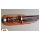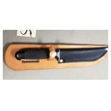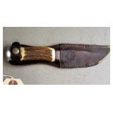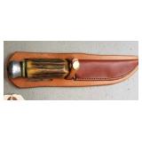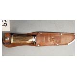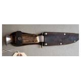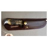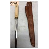 513 Colonial Prov. USA Stamped Fixed Blade Knife With bone handle & new leather sheath.
