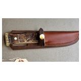 524 Western Stainless Steel USA Marked Fixed Blade Knife in Hallanger stamped leather sheath.
