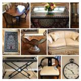 Multiple Persian-style rugs from throw to whole-room sizes, side tables, sofas, unusual lighting, dining table with 8 chairs, asian style glass front cabinets, Baldwin upright piano, new-in-box Neiman Marcus handmade crystalline 4 goblet set, Dyson and Kirby vacuums, Waterford throw pillows, 2 wood chests with steer handles, artwork from small to whole wall sizes, designer floral arrangements, small and large flatscreen TVs and more.