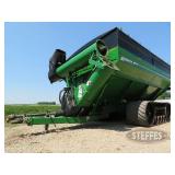 GRAIN CART & GRAVITY WAGON 2015 Brent 1396 tracked grain cart, 1000 PTO, 22" auger, hyd. swivel spout, w/corded remote, roll tarp, rearview camera w/Cab Cam color display, Digi Star 520 scale w/Auto-Log, rear hitch, Unverferth track system (S/NB33730116), 36" belts, green, S/NB33780114, single owner Kory gravity box, 200 bu., hyd. drill fill auger, on 4-wheel running gear, 11L15 tires