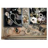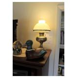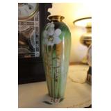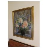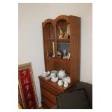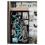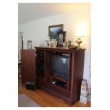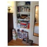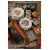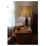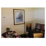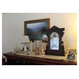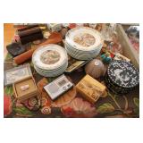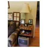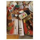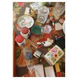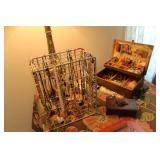 Jewelry Silver flatware Jewelry Decor W.A. Pickard vase Sea urchin Sterling silver jewelry Vintage floor lamp Wall art Chairs Desk Media Board games VHS tapes Harrods bag Media armoire Electronics TV Vintage Mantel clock Lladro Cups and saucers Vintage china Dining table and 4 chairs Silverplate decor Green fabric sofa w/ pillows Oak end table Framed wall art Cabinet and hutch Cameras