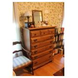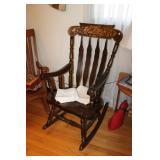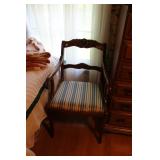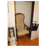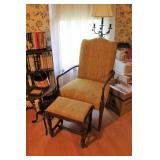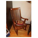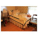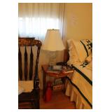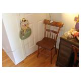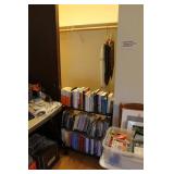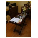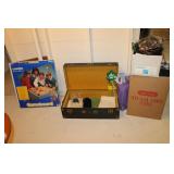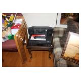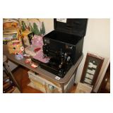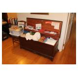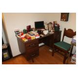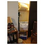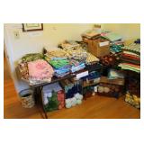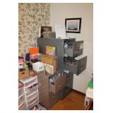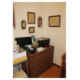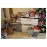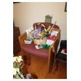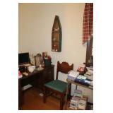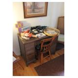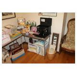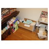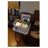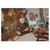 Yarn Fabric Wall art Singer Featherweight sewing machine w/ case Vintage rocking chair Desk Candles Paper shredder Set of 4 80s modern oak office chairs Electronics Plaid sleeper sofa End table Lamps Pair of traditional end tables Quarter sawn oak rocking chair Rocking chair Wood nightstand Wood bed frame Twin mattress and boxspring Vintage carved wood chair Vintage shelving Books Vintage arm chair and ottoman Vintage floor lamp File cabinets Plastic organizers Crafting supplies Vintage globe Art supplies Lane cedar chest