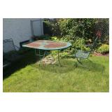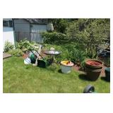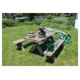 Concrete bench Wrought iron patio set w/ 6 chairs Picnic table Lawn and garden Toro snowblower