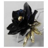 Vintage Signed Coro Black Enamel Gold Tone Rhinestone Flower Pin Brooch |
