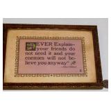 Antique c. 1910 "Never Explain" Elbert Hubbard Roycroft Printed Quote FRAMED |