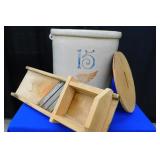 BEAUTIFUL VINTAGE 15 GALLON REDWING CROCK IN GOOD CONDITION. COMES WITH WOODEN LID AND A VERY NICE VINTAGE WOODEN CABBAGE SLICER. ALL IN ON GOOD CONDITION. PLEASE SEE PHOTOS FOR DETAIL