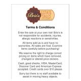 Enter the sale at your own risk! Brie’s is not responsible for accidents, injuries, allergic reactions or sensitivities. All items sold as is and have no warranties. All sales are final. Examine items carefully before purchasing! We reserve the right to charge correct pricing on items which have removed, changed or altered price stickers. Cash, good checks, VISA, MasterCard, Discover Card and American Express accepted. Credit cards over $10 please. Sorry but there is no staff available to assist in moving heavy objects.