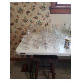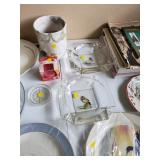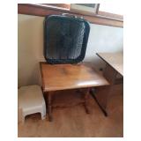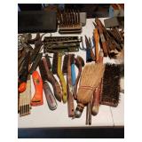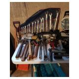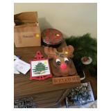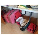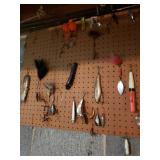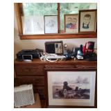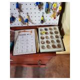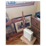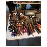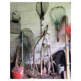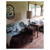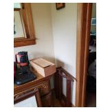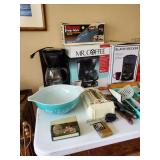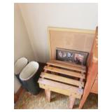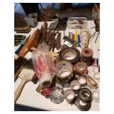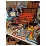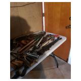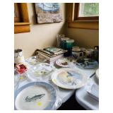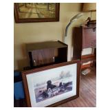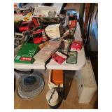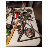 Vintage fishing poles and lures Jules A. Bouillet loom decoy Tools Vintage tools Ladders Artwork Sewing supplies File cabinet Pickard China made for Abercrombie & Finch Pickard rose & daisy vases Pickard rose & daisy bowls Verilux light Antique secretarial desk Coffee makers Dining table with three chairs Singer sewing machine Gun rack Gun cabinet Shelves Men's clothing Bench Mid century end table Mid century chest Couches Tapestry Captain chairs Mid century tree skirt Bed Quilt Lamps Claw foot chest Antique chest Work benches Mid century kitchen chairs Rocking chairs Cooking pots Chests Dressers Couches End table and coffee table Pink Samsonite luggage Home decor Vintage handmade Christmas ornaments Fishing nets Chest sets