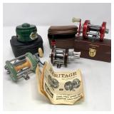 Vintage fishing reels including an Ambassador 6000, Meisselbach Catucci and Pflueger Skilkast reel from 1963, plus a collection of fly rods and cases including an Abercrombi & Fitch Banty 44. Finally, a collection of vintage flies and even a vintage Evinrude Lightwin Motor!
