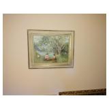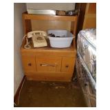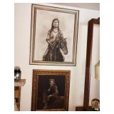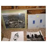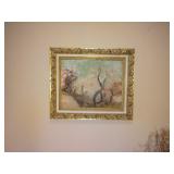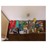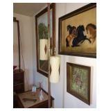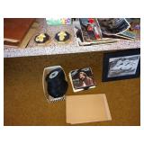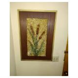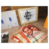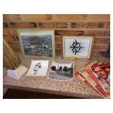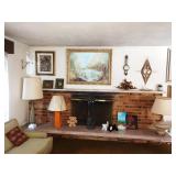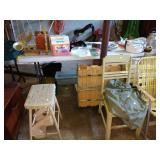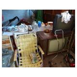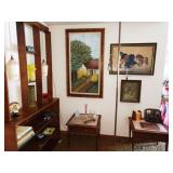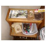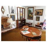 Basement Room Left: Gold Squares (Varies Designs) Picture Frames MCM Tile Coffee Table Table Lamp Oil Paintings Small Vintage Phone Mosaic Picture Rattan Rockers Clock Christmas Stuff Puzzles