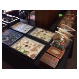 A very full sale including Dozen+ nice Lladro Figurines, Silver Coins, Clad Coins, 10,000 Pennies, Nice Selection of Costume & Gold Jewelry, large selection of Antique Prints & Art, Royal Doulton, 14 shelves of modern Disney Collectibles, Franklin Mint, Dolls include Madame A's and by the box, Oriental Porcelains, WWII Board Games, good selection of Carnival, Pattern and Depression Glass, Silverplate, Longaberger, Antiques & Collectibles