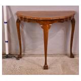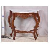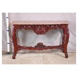 Carved mahogany console table with pink marble top; 662-1696 - stretcher base - 50.5x16.5x32